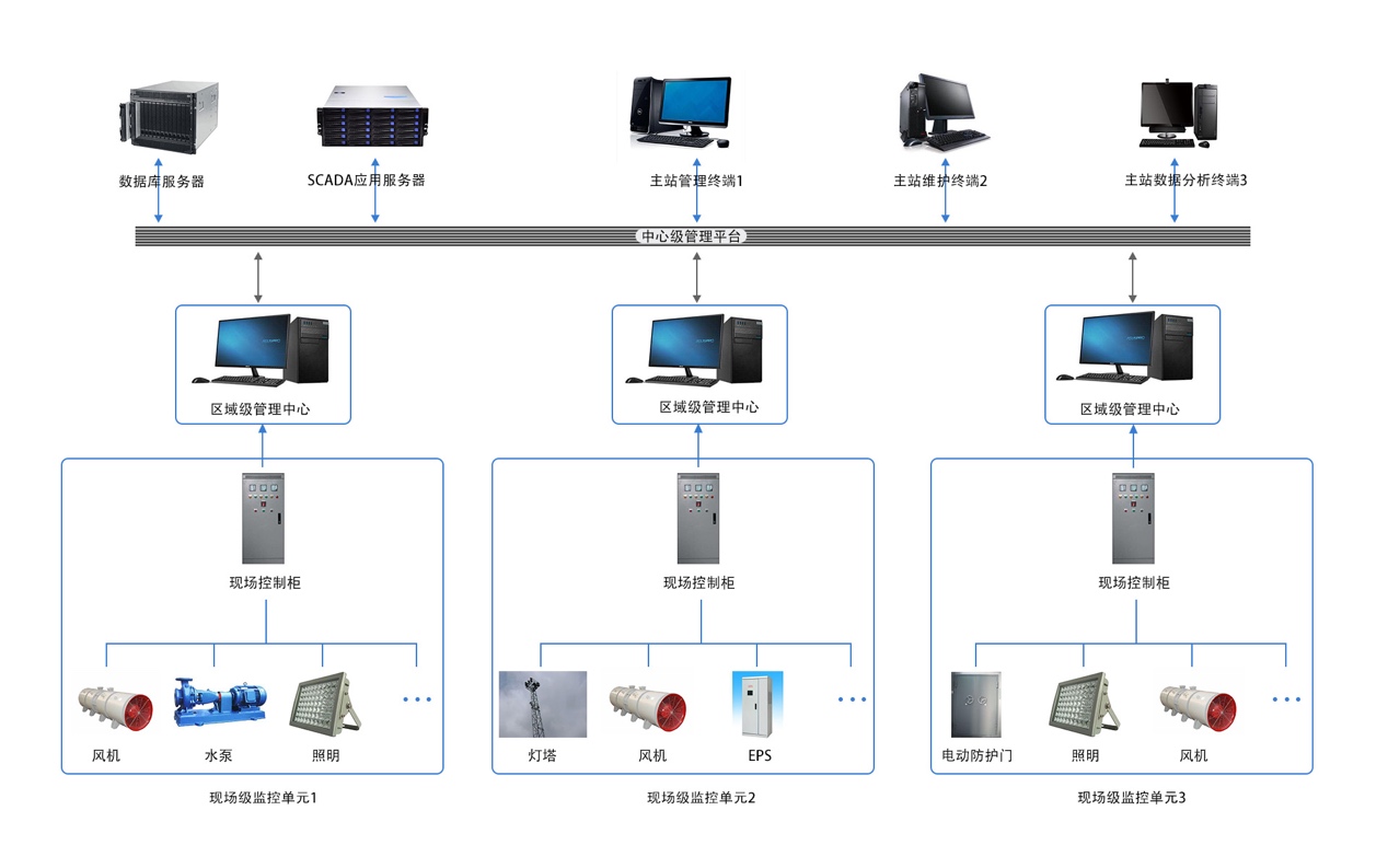 公共防災(zāi)救援設(shè)備監(jiān)控系統(tǒng)采用多層分級(jí)結(jié)構(gòu),自上而下劃分為中心級(jí)管理平臺(tái)、區(qū)域級(jí)管理中心和現(xiàn)場(chǎng)級(jí)監(jiān)控單元。其中現(xiàn)場(chǎng)級(jí)監(jiān)控單元包括水泵,風(fēng)機(jī),照明,電動(dòng)防護(hù)門(mén),燈塔,EPS等現(xiàn)場(chǎng)設(shè)備以及負(fù)責(zé)現(xiàn)場(chǎng)設(shè)備監(jiān)控的現(xiàn)場(chǎng)控制柜。