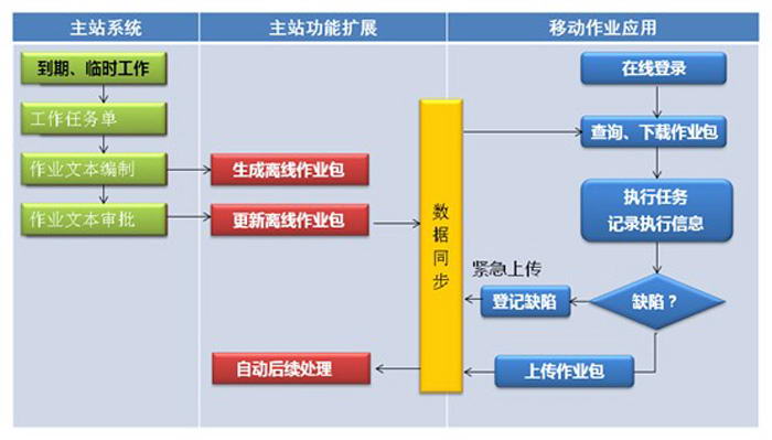 系統(tǒng)將任務(wù)分配(調(diào)度)給運(yùn)維人員, 運(yùn)維人員即可通過(guò)移動(dòng)終端下載任務(wù),然后離線(xiàn)現(xiàn)場(chǎng)作業(yè),并將現(xiàn)場(chǎng)作業(yè)內(nèi)容及時(shí)錄入(文字,語(yǔ)音,圖片,視頻)系統(tǒng),最后再將工作記錄上傳至服務(wù)器.